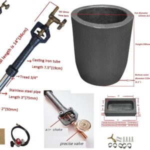 - 【What You Will Get】1 propane smelting furnace, 16KG&6KG graphite Crucibles, 113ML Graphite casting Mold:, dual forge burners, 1.5m gas hose with regulator, 1 refractory brick, 1 carbon mixing stickes (0.8X30cm) , duty lift tong for metal smelting, 1 protective gloves, igniter, PTFE tape, user manual. We are the professional seller of smelters for all metal full kit. If there is any product problem or using problem, you could contact us directly, we will guarantee 100% satisfaction.
