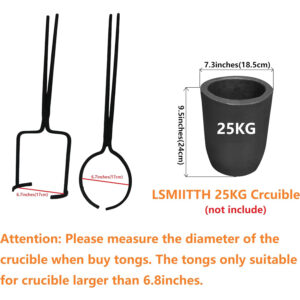- The crucible tongs jaw size are 6.7 inches, they are perfect for the Lsmiitth crucibles of 25KG, which outer diameter is 7.3inches. The tongs do not suitable for the crucibles which diameter is less 6.8inches.