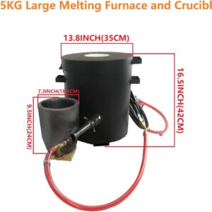 • 【25KG Large Melting Furnace】The 25KG melting furnace with a large capacity, which inner size is 9.8″ diameter x 11.8″Height (25cm x 30cm). This large metal smelter equipped with 25KG/55lbs large crucible, which size is 7.3” x 9.5”(18.5*24cm), can melt 25KG copper, 46.8KG gold, 7.5KG aluminum, 29.5KG silver. Everything well done, you just need a propane tank to start the melting!